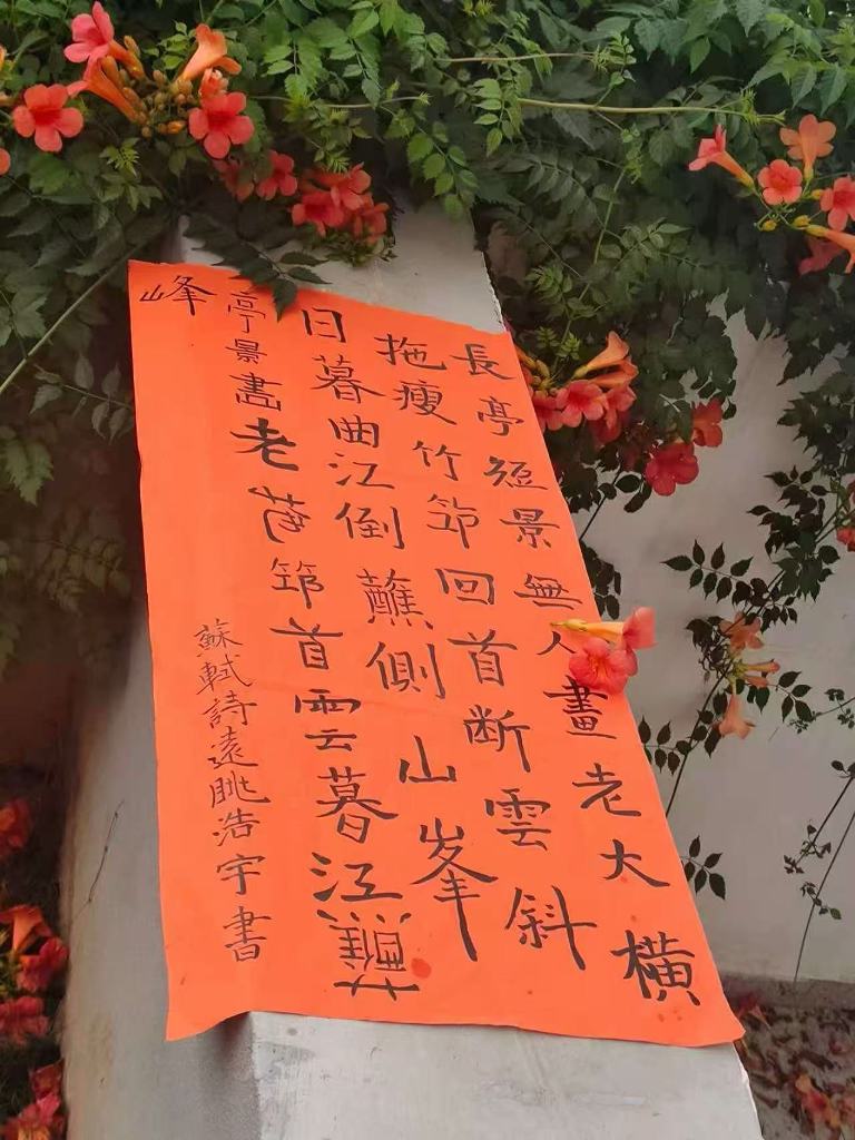 During the preparation process, with the careful guidance of his instructor (冯丽雯,蓝奕), Haoyu dedicated significant time and effort to understanding the structural principles of wisdom-style calligraphy, repeatedly practicing brush techniques, and finally completing the composition of the entire piece. He expressed, "Wisdom-style poetry is not just a visual game but an expression of the profound beauty of Chinese characters. Through writing this poem, I have deepened my appreciation for the richness of the Chinese language and the unique charm of Chinese culture."